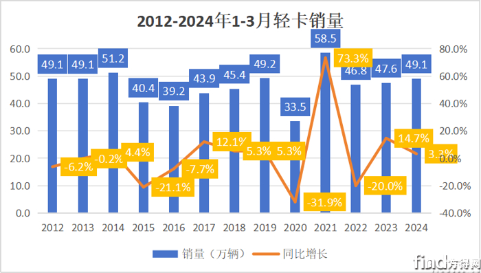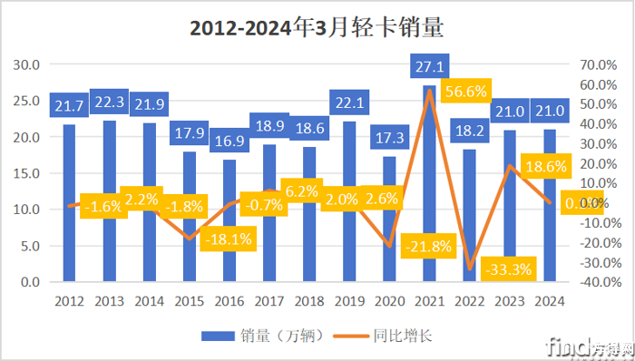據(jù)數(shù)據(jù)顯示,今年3月份,我國(guó)輕卡市場(chǎng)銷量20.98萬(wàn)輛,環(huán)比增長(zhǎng)84.07%,同比增長(zhǎng)0.11%。2024年1-3月銷量49.12萬(wàn)輛,同比增長(zhǎng)3.27%。這意味著2024年一季度銷量不僅追平了去年,同樣高于疫情前的2017、2018年。