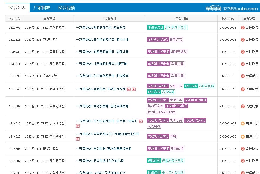 此外,從車質網的投訴來看,包括一汽奧迪A4L、A6L、Q5L等也存在一些投訴,包括發(fā)動機故障燈亮、 車身共振等,能否妥善解決車主的投訴,也將在相當程度上影響一汽奧迪的品牌與口碑。