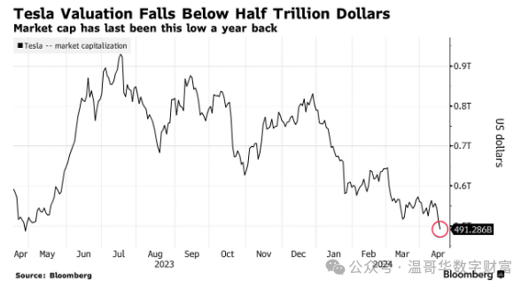 產品力的下降導致了特斯拉在2024年第一季度的交付量在四年間首次同比下降,遠低于市場預期。見狀,投資人心生退意,特斯拉市值于上周在近一年來首次跌破5000億美元,較巔峰時期下跌超過一半。