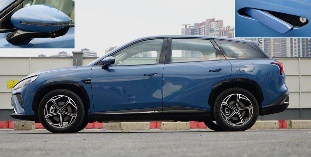 側(cè)面造型中規(guī)中矩,軸距適中、前后懸較長(zhǎng),車(chē)頂略帶下壓、腰線輕微上揚(yáng),D柱隱藏式布置營(yíng)造出懸浮車(chē)頂?shù)男ЧT黾恿谁h(huán)繞式黑色底裙和亮黑色輪眉,強(qiáng)化SUV的越野味道。細(xì)節(jié)上,雙色外后視鏡集成側(cè)轉(zhuǎn)燈和攝像頭,前翼子板處有黑色飾條,提供半彈出式的隱藏門(mén)把手。