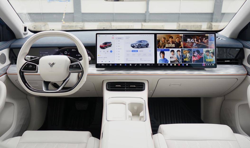 車(chē)廂布局確實(shí)有理想的味道,兩塊15.6英寸的大屏組合,幾乎把中控臺(tái)擺滿(mǎn)了。橫向拉伸的中控臺(tái)頂部是藍(lán)色磨砂材質(zhì),豎立的黑色烤漆面板嵌入儀表屏,隱蔽性較高。下方臺(tái)面增加拉絲鋁面板和玫瑰金飾條,提升精致度。采用懷擋式電子擋位,扶手臺(tái)成為純粹儲(chǔ)物空間。提供16個(gè)喇叭的環(huán)繞音響系統(tǒng)和64色氛圍燈。