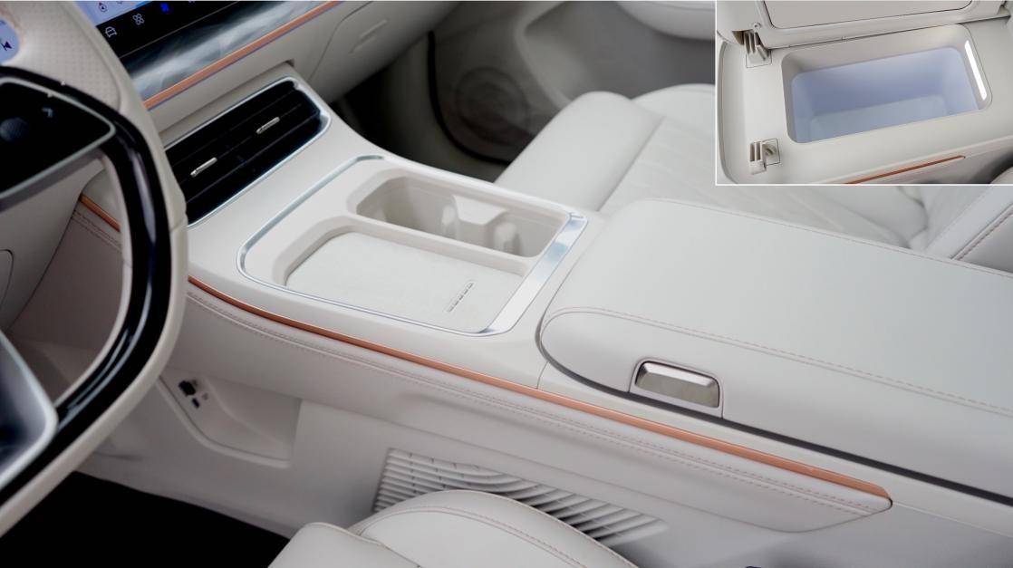 扶手臺(tái)位置較高,內(nèi)置車(chē)載冰箱,沒(méi)有下方懸浮空間。只提供單手機(jī)位置,帶50W無(wú)線充電,有帶限位的雙杯架。冰箱門(mén)可向兩側(cè)開(kāi)啟,內(nèi)部容量6.6L,下方有獨(dú)立的壓縮機(jī),可在-6—50度之間調(diào)節(jié)。臺(tái)面兩側(cè)提供USB接口。