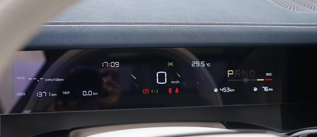 液晶儀表屏嵌入臺(tái)面內(nèi)部,較為細(xì)長(zhǎng),顯示主要的行車(chē)信息。