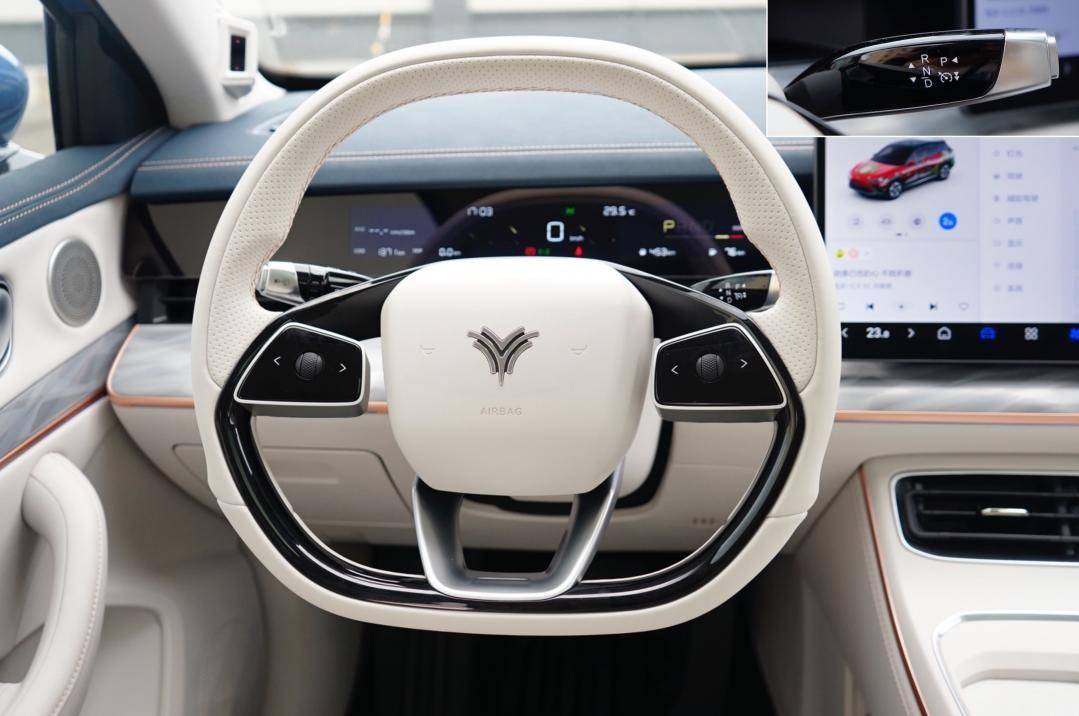 仿皮材質(zhì)方向盤(pán)上方鏤空較大,保證不遮擋儀表屏,下方增加了黑色內(nèi)襯,帶來(lái)不同的手感。兩側(cè)橫幅控制區(qū)采用極簡(jiǎn)布置,提供5向調(diào)節(jié)的滾輪,操作方式與特斯拉相同,可上下滾動(dòng)、左右撥動(dòng)和按壓確認(rèn),容易上手。右后方集成懷擋式電子擋位,下拉兩次進(jìn)入駕駛輔助,與特斯拉也相同,提供L2級(jí)的駕駛輔助系統(tǒng)。