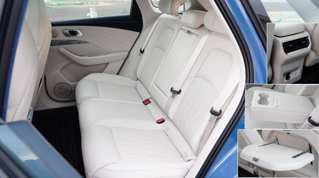 后排座椅材質(zhì)與前排相同,坐墊長(zhǎng)度合適,只是高度偏低,靠背有少量側(cè)向支撐,頭枕同樣有側(cè)向支撐。空間方面,侃弟身高175cm,腿部有三拳、頭頂接近兩拳、橫向可乘坐三人,地板為全平。提供地臺(tái)出風(fēng)口帶USB接口、帶雙杯架的可翻折扶手、車(chē)頂有帶電動(dòng)遮陽(yáng)簾的大天窗,右側(cè)座椅還提供小桌板,方便在車(chē)內(nèi)工作和娛樂(lè)。