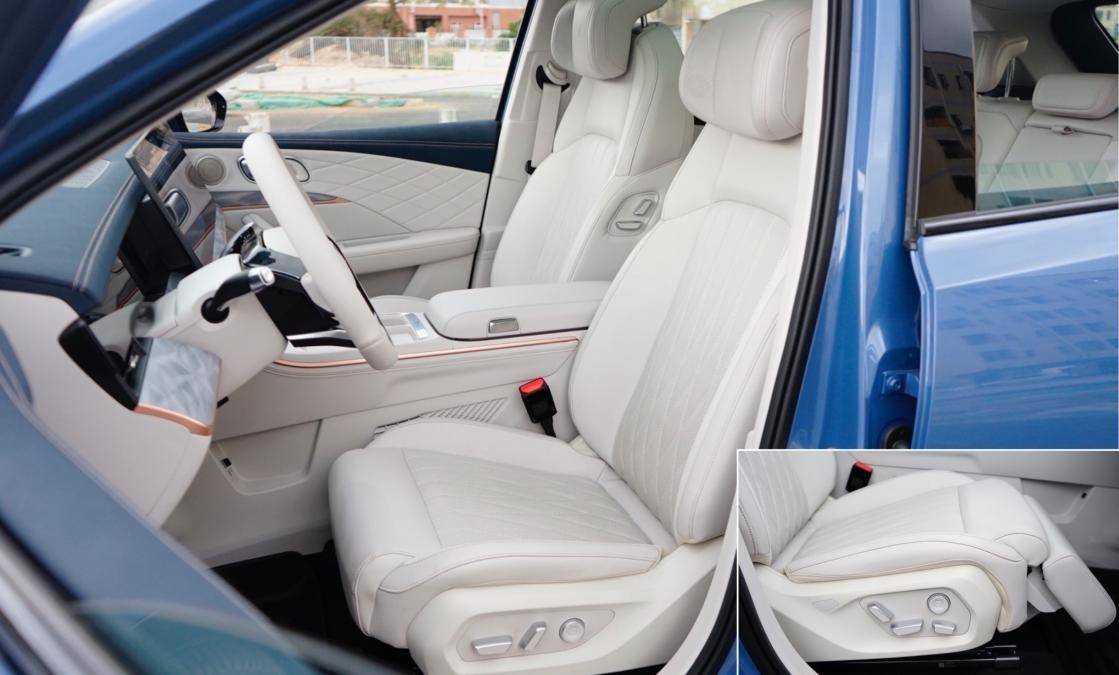 增程版的中高配車(chē)型都提供功能全面的仿皮座椅,主駕為10向調(diào)節(jié),包含4向腰撐調(diào)節(jié),坐墊長(zhǎng)度合適,填充物軟硬適中,靠背側(cè)向支撐足夠,頭枕也有良好的側(cè)翼支撐。副駕安排了零重力座椅,支持14向調(diào)節(jié),增加了電動(dòng)腿托和整體向后傾斜,實(shí)現(xiàn)真正的躺平。前排座椅都有通風(fēng)、加熱和多點(diǎn)按摩,都有頭枕音響,配置確實(shí)豐富。