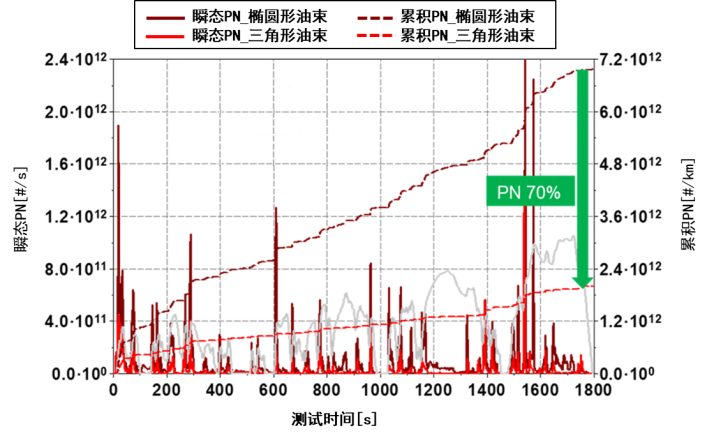 冷機多次噴射,特別是多于3次噴射,可顯著縮短油束貫穿距,降低燃油濕壁(氣閥、活塞、缸壁)所導致的PN排放,特別是在冷機且發動機負荷急速增加的工況下。如圖3所示的傳統燃油車,在WLTC 冷機階段的加速工況,通過4次噴射策略,將原始PN排放 降低了1/3。