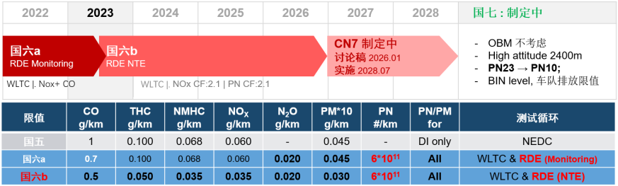 相比于國五,國六b階段要求的常規氣體排放限值降低了約50%,標準顯著加嚴,且首次引入了顆粒物數量(PN)排放限值和RDE測試要求。