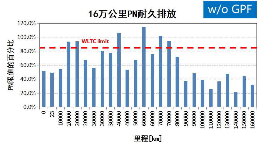 需要重點指出的是 ,耐久工況下,隨著里程的增加,PN排放波動很大。如圖2 a) 所示, 在不裝GPF的16萬公里耐久測試中,WLTC的原始PN排放在20%到118%限值范圍內波動。也就是說,即使新車滿足排放法規,也可能在后續的耐久測試中出現排放超標的情況。而如果加裝了GPF,如圖2 b)所示,在整個20萬公里的耐久測試中,PN排放都保持在非常低的水平,確保了完全滿足排放法規。因此,目前歐洲乘用車全部搭載GPF,國內絕大部分乘用車也采用GPF來控制顆粒物排放。