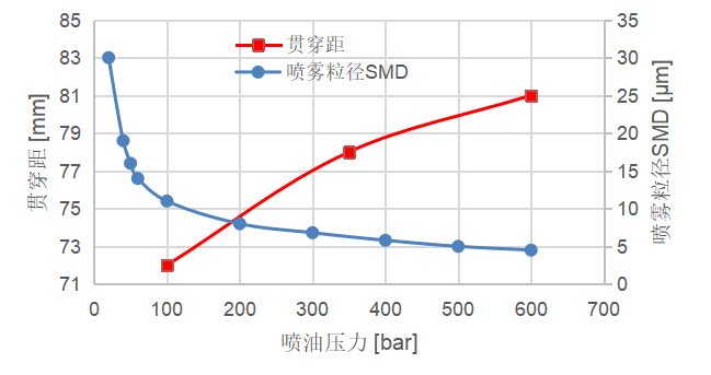 ■圖7 噴霧粒徑SMD和油束貫穿距隨噴射壓力的變化