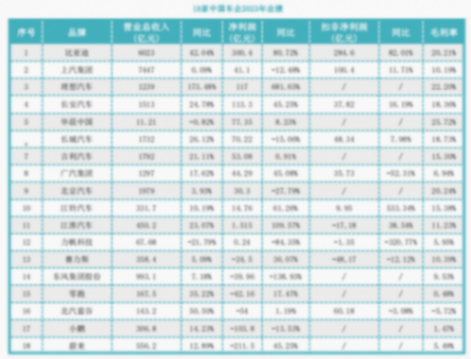 下方表格展示了國內18家上市車企(主要有乘用車業務)2023年財報,其中盈利的最強的比亞迪為300.4億元人民幣,換算為美元的話為41.5億美元,僅比日產多了9個百分點。