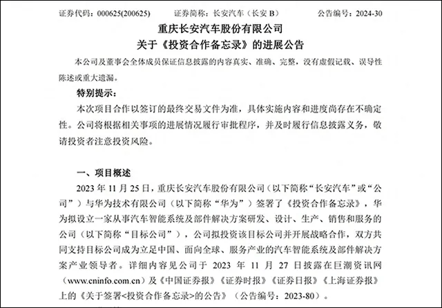 果然,5月6日晚,長安汽車披露了與華為簽訂《投資合作備忘錄》的進展,雙方就合資公司(引望)的財務、法務、業務,基本完成了技術盡調,雙方預計不晚于2024年8月31日簽訂最終交易文件。