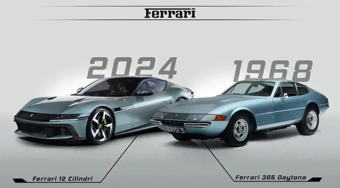 12 Cilindri也采用了類似的設計方案,用一整塊貫穿式的黑色玻璃覆蓋在車頭。同時12 Cilindri就連輪廓都采用了和365相同的楔形設計,這也是兩者有著高度相似度的最根本原因,形和神都很相近。