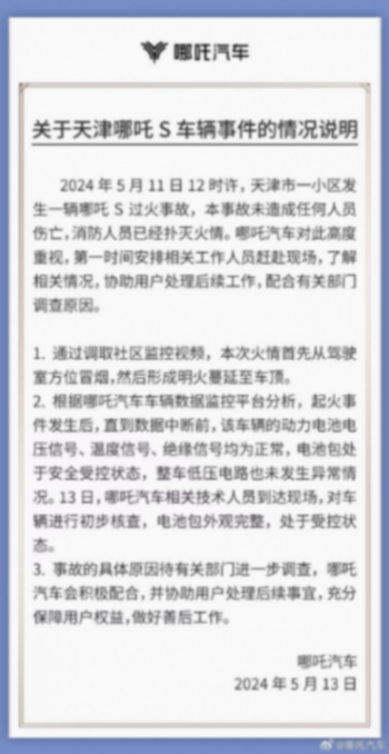 5月13日,哪吒汽車官方也發表了聲明,表示起火事件發生后,該車輛的動力電池電壓信號、溫度信號絕緣信號均為正常,電池包處于安全受控狀態,整車低壓電路也未發生異常情況。電池包外觀完整,處于受控狀態。