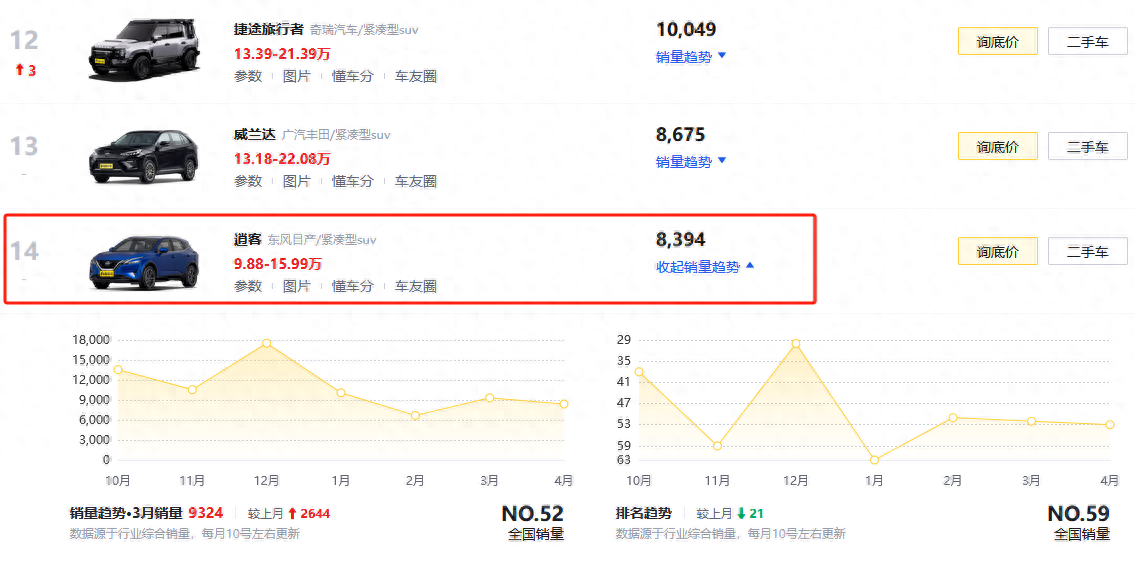 自從進入2020年以來,國產新能源車就實現了井噴式發展,到了今天也有能力與合資車爭奪市場份額了,因此我們才能看到合資車大幅降價的情形。在緊湊型SUV細分領域,日產逍客從登陸國內汽車市場以來,口碑和銷量一直都不錯,就算在汽車電動化加劇的時代,它在今年4月份依舊賣出8394臺新車,成績較為可觀。其中逍客2.0L經典舒適版在經銷商處的報價已經跌至9.88萬元,那么它真值得入手嗎?