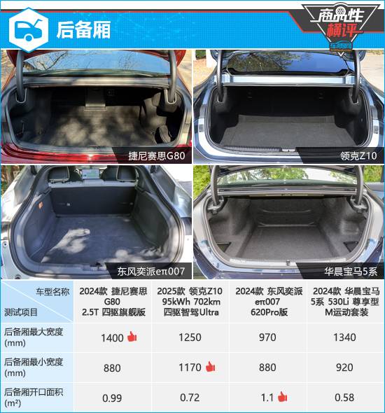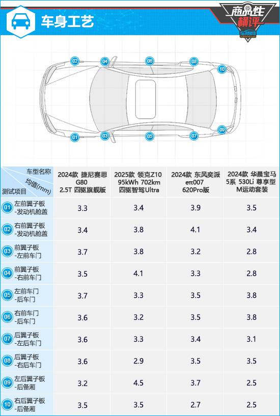 通過(guò)以上各項(xiàng)對(duì)比不難發(fā)現(xiàn),本次選取的四款高關(guān)注度中大型車在商品性方面均交出了令人滿意的答卷。作為傳統(tǒng)豪華品牌車型,捷尼賽思G80和華晨寶馬5系在車身縫隙控制、人機(jī)工程學(xué)設(shè)計(jì)等方面表現(xiàn)尤為出色,體現(xiàn)出較高的工藝水準(zhǔn)和深厚的設(shè)計(jì)功力。領(lǐng)克Z10在整車漆膜厚度和噴涂均勻性方面成績(jī)突出,同時(shí)在噪音抑制方面也有著不錯(cuò)的表現(xiàn)。東風(fēng)奕派eπ007則在天窗尺寸和車外視野測(cè)試中占據(jù)較大優(yōu)勢(shì),后雷達(dá)探測(cè)能力也與華晨寶馬5系并列第一。四款車在商品性方面雖然都有需要提升的地方,但總體來(lái)看瑕不掩瑜,完全可以滿足日常使用需求。
