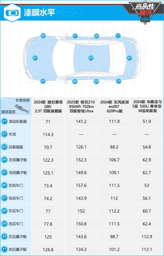 在漆膜水平環(huán)節(jié),從測(cè)試結(jié)果來(lái)看,領(lǐng)克Z10表現(xiàn)更加亮眼,整車漆膜平均厚度在測(cè)試過(guò)的車型中處于中上游水平,同時(shí)噴涂均勻性也優(yōu)于另外三款車。捷尼賽思G80和東風(fēng)奕派eπ007的漆膜厚度均達(dá)到中游水平,前者噴涂均勻性表現(xiàn)稍遜于后者。相比之下,華晨寶馬5系不僅整車漆膜厚度在四款車中墊底,漆膜噴涂均勻性也存在提升空間。