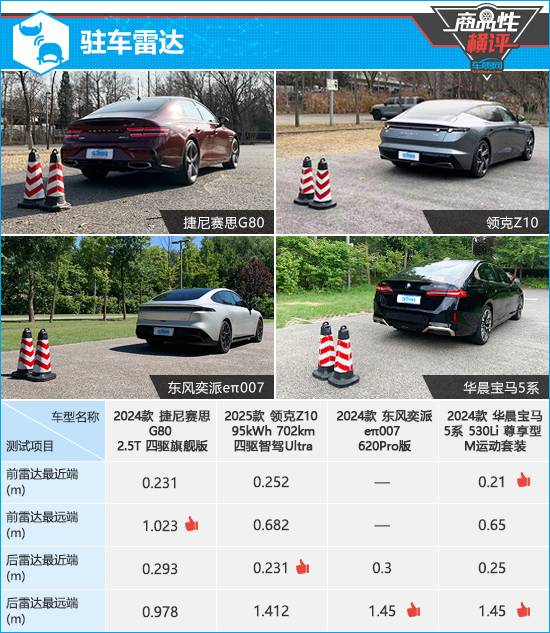 在雷達(dá)感應(yīng)測(cè)試中,根據(jù)已有測(cè)試數(shù)據(jù)來(lái)看,東風(fēng)奕派eπ007和華晨寶馬5系的后雷達(dá)探測(cè)能力較強(qiáng)。持續(xù)蜂鳴階段提示距離方面,領(lǐng)克Z10表現(xiàn)相對(duì)更好,而東風(fēng)奕派eπ007的后駐車?yán)走_(dá)持續(xù)蜂鳴提示距離與測(cè)試均值相差較大。