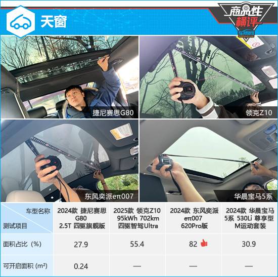 在針對(duì)天窗的測(cè)試中,捷尼賽思G80配備可開(kāi)啟全景天窗,其余三款車均配備不可開(kāi)啟全景天窗。具體尺寸來(lái)看,根據(jù)已有測(cè)試數(shù)據(jù),東風(fēng)奕派eπ007的天窗采光面積較大,能夠?yàn)檐噧?nèi)乘員帶來(lái)更好的通透性。