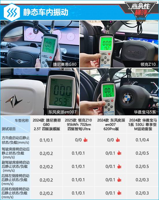 在靜態(tài)車內(nèi)振動(dòng)測(cè)試中,東風(fēng)奕派eπ007整體表現(xiàn)更好,方向盤位置在兩種狀態(tài)下的振動(dòng)數(shù)值始終為0,前后排座椅的振動(dòng)數(shù)值也控制在較低水平。領(lǐng)克Z10成績(jī)緊隨東風(fēng)奕派eπ007之后,整體表現(xiàn)同樣可圈可點(diǎn)。對(duì)比之下,捷尼賽思G80和華晨寶馬5系兩款燃油動(dòng)力車型表現(xiàn)相對(duì)遜色,后者在負(fù)載狀態(tài)下所有測(cè)試部位的振動(dòng)數(shù)值明顯升高,體感略微明顯。