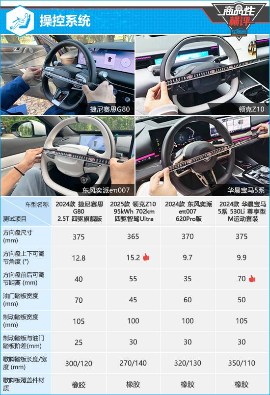 在操控系統(tǒng)方面,捷尼賽思G80和華晨寶馬5系的方向盤尺寸相對(duì)適中,可兼顧操控穩(wěn)定性和靈活性,其余兩款車的方向盤尺寸略小。方向盤調(diào)節(jié)方面,領(lǐng)克Z10上下可調(diào)節(jié)角度領(lǐng)先于另外三款車,華晨寶馬5系則在前后調(diào)節(jié)距離方面占據(jù)明顯優(yōu)勢(shì)。