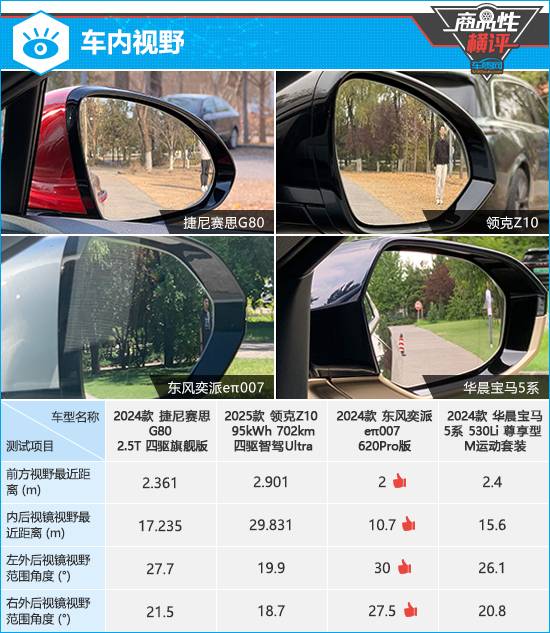 在外后視鏡視野范圍測(cè)試中,東風(fēng)奕派eπ007的兩側(cè)外后視鏡測(cè)試成績(jī)均達(dá)到同級(jí)別上游水平。相比之下,領(lǐng)克Z10的左側(cè)外后視鏡測(cè)試成績(jī)未達(dá)到同級(jí)別平均水平,存在一定的視野盲區(qū)。
