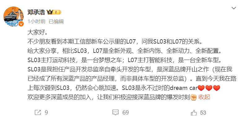 總結:雖然官方宣布深藍L07采用的是全新設計,但是從公布的外觀來看,兩者并沒有太大的改變,并且不少人覺得它是深藍SL03的改款車型,不過從目前的情況來看,深藍L07大概率在車機系統和智駕方面會給我們帶來一定的驚喜。