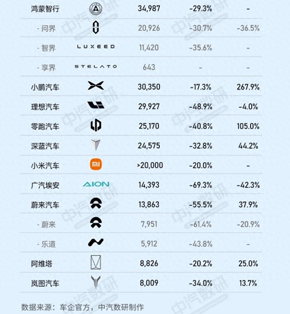 可以看到,華為鴻蒙智行排在第一名,銷量為34987輛,比理想、小鵬、理想等等所有車企都要多。