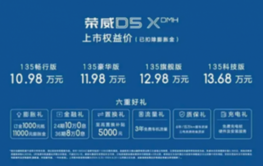 5月20日,上汽榮威D5X DMH正式上市,官方指導(dǎo)價區(qū)間為11.98萬-14.68萬元,與預(yù)售價一致。即日起至6月30日下訂,可享訂金1000元抵1.1萬元膨脹禮,相當(dāng)于優(yōu)惠1萬元,優(yōu)惠后售價區(qū)間為10.98萬-13.68萬元。