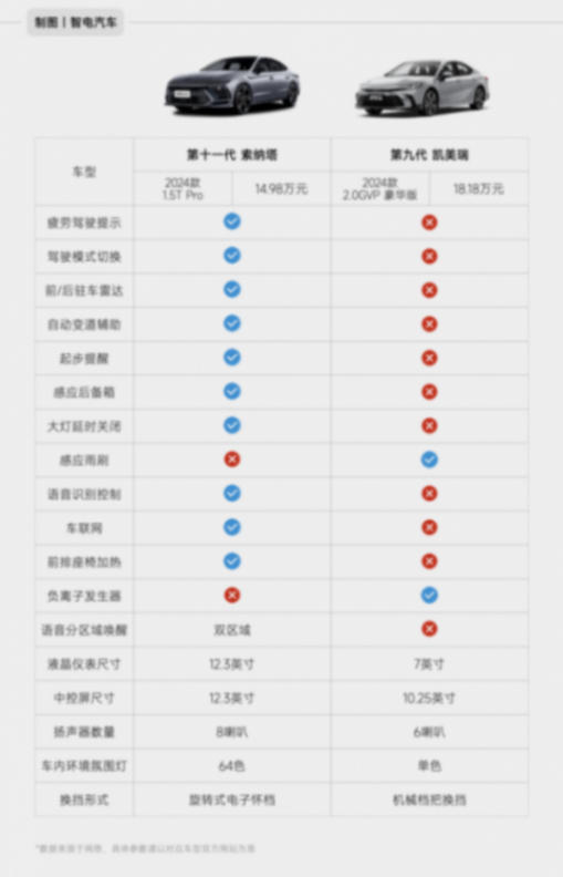 當然,更多消費者購車還是會盡量選擇中高配車型,我們不妨拿第十一代索納塔1.5T Pro和第九代凱美瑞2.0GVP豪華版對比:無論是前后駐車雷達、起步提醒、車聯(lián)網(wǎng)、語音識別控制等智能科技配置,還是前排座椅加熱、揚聲器數(shù)量、車內(nèi)環(huán)境氛圍燈等舒適性感官體驗配置,第九代凱美瑞缺失的,第十一代索納塔都一應俱全,價值感孰優(yōu)孰劣一目了然。