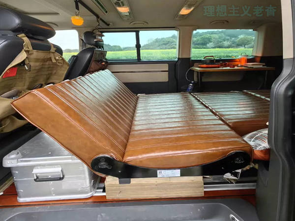 放平中后排座椅就是一張豎床,床鋪還可作辦公椅使用,下面是儲物倉存放物品。