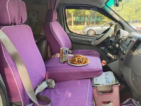 駕駛室簡潔樸素,前排3座,中間座椅向前折疊就變身出小桌,放上了牛奶零食。