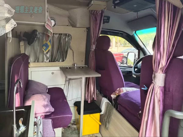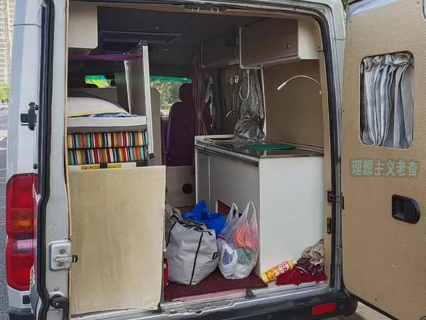 車內后面右側放置的是一張櫥柜,上面有自來水和電磁爐,下面有炊具和食材,自駕游途中隨時可駐車做飯。