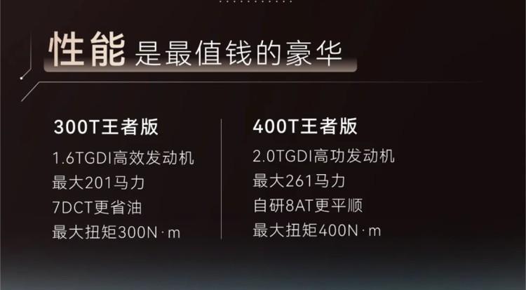 動力方面,凌云王者版提供1.6TGDI、2.0TGDI兩種動力可選,最大功率分別為201馬力、261馬力,最大扭矩300Nm、400Nm,與之匹配的分別是7速雙離合變速器和8速行星齒輪變速器,都是奇瑞自研。