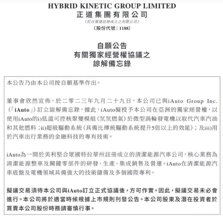 對很多人來說,iAuto集團(tuán)很陌生。iAuto成立于2018年,原名慧擇汽車,注冊地在美國,是一家清潔能源汽車公司。2023年9月,它曾與正道集團(tuán)簽署協(xié)議,授予其在亞洲的獨家經(jīng)營權(quán),為其提供低溫可控核聚變模組技術(shù)以及用于汽車出行業(yè)務(wù)的金融科技專有技術(shù)。正道同樣是一家從事電動汽車業(yè)務(wù)的香港公司,電車開發(fā)、銷量、電池管理、電池材料開發(fā)等都是主營業(yè)務(wù)。
