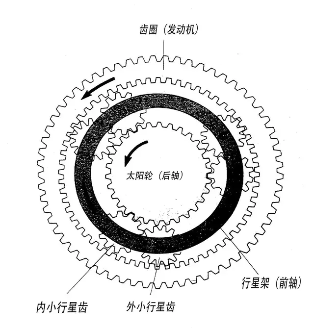 一般直線行駛情況下,前后軸速度相同,行星齒輪結構中無相對運動,前后軸動力分配為50:50。當前后軸產生轉速差,行星架與太陽輪之間相對轉速的快慢決定雙方的主被動關系,兩者齒比差異決定動力分配的變化,因此前后軸的動力分配可以在43:57至60:40之間無級切換。
