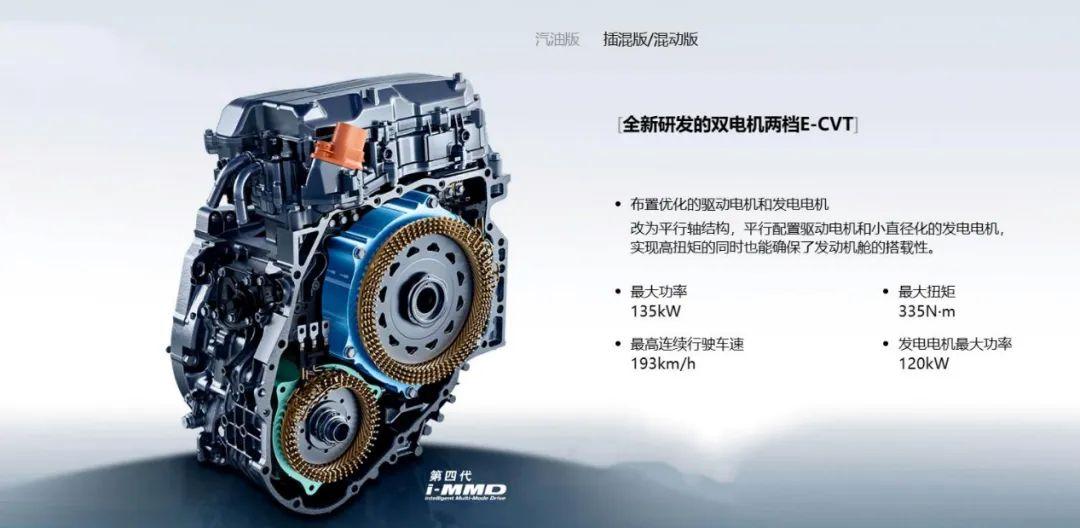皓影HEV和e:PHEV車型搭載了第四代i-MMD 雙電機混動系統,采用全新2.0L直噴阿特金森引擎最大熱效率達到41%。引擎輸出是150馬力。