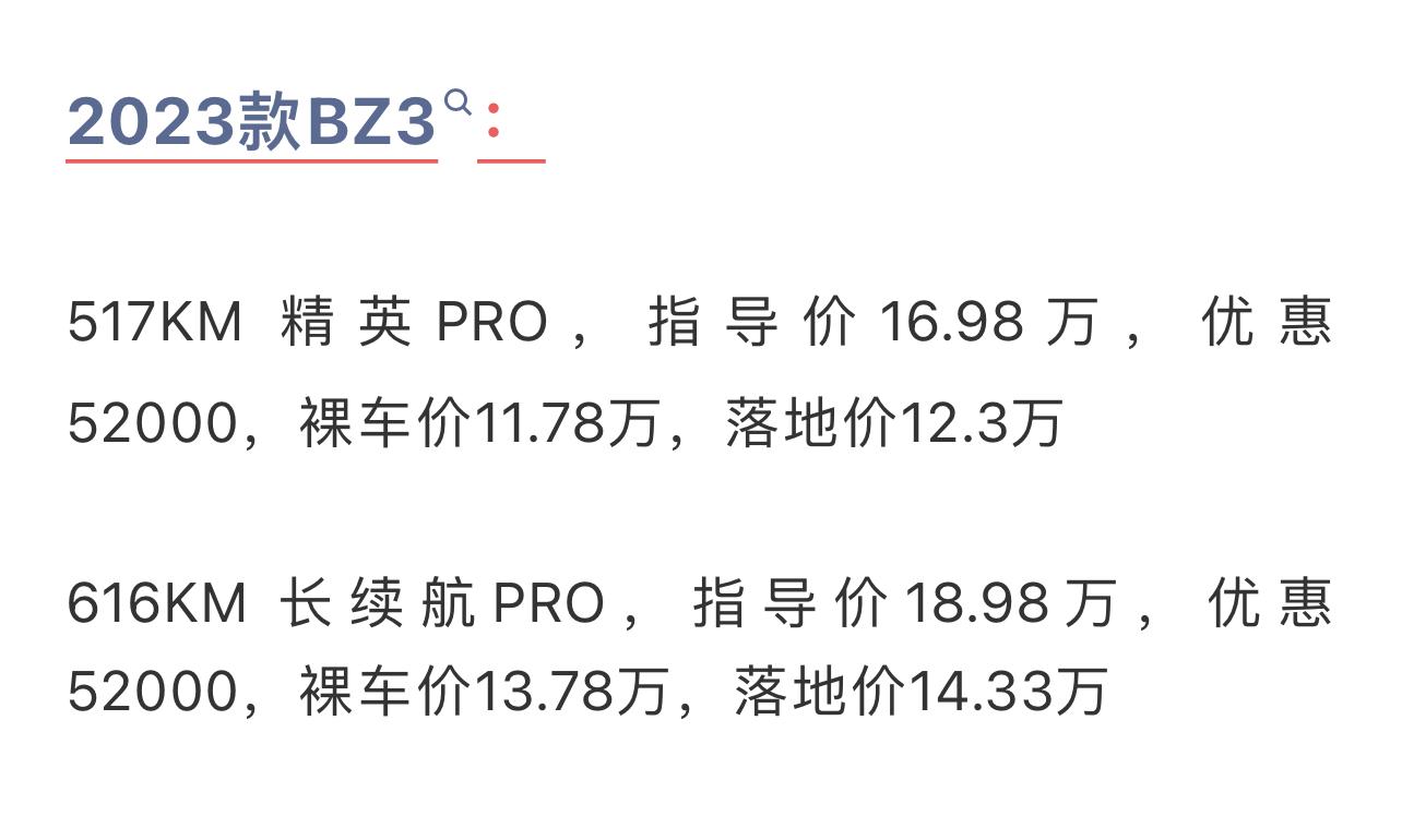 廢話不多說,分享一下5月份bZ3的真實(shí)行情。517千米續(xù)航精英PRO版,指導(dǎo)價(jià)16.98萬,現(xiàn)在終端能優(yōu)惠5.2萬,裸車都不到11.8萬,落地在12.3萬上下。616KM長續(xù)航PRO版,優(yōu)惠后實(shí)際落地價(jià)在14.3萬左右。