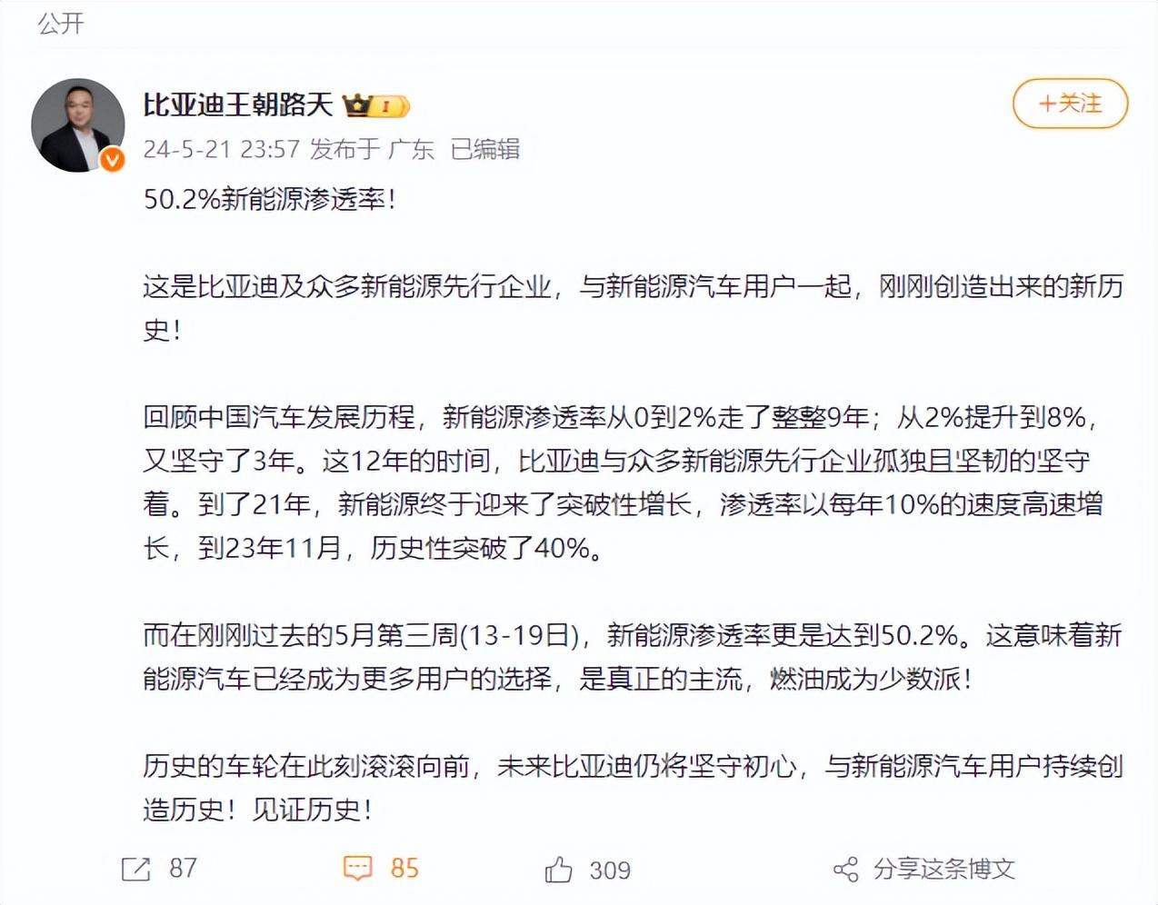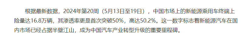 按照乘聯(lián)會(huì)公布數(shù)據(jù),2024年4月上半月,國內(nèi)新能源車零售滲透率突破50%,而本次5月第三周國內(nèi)新能源乘用車上險(xiǎn)量達(dá)到16.8萬輛,新能源終端上險(xiǎn)滲透率也首次超過50%。這意味著新能源車型從此刻開始已經(jīng)有了超越燃油車型的市場份額,算無異于是重大突破,而這項(xiàng)新歷史是由比亞迪和眾多新能源先行企業(yè),以及諸多新能源用戶一起實(shí)現(xiàn)。