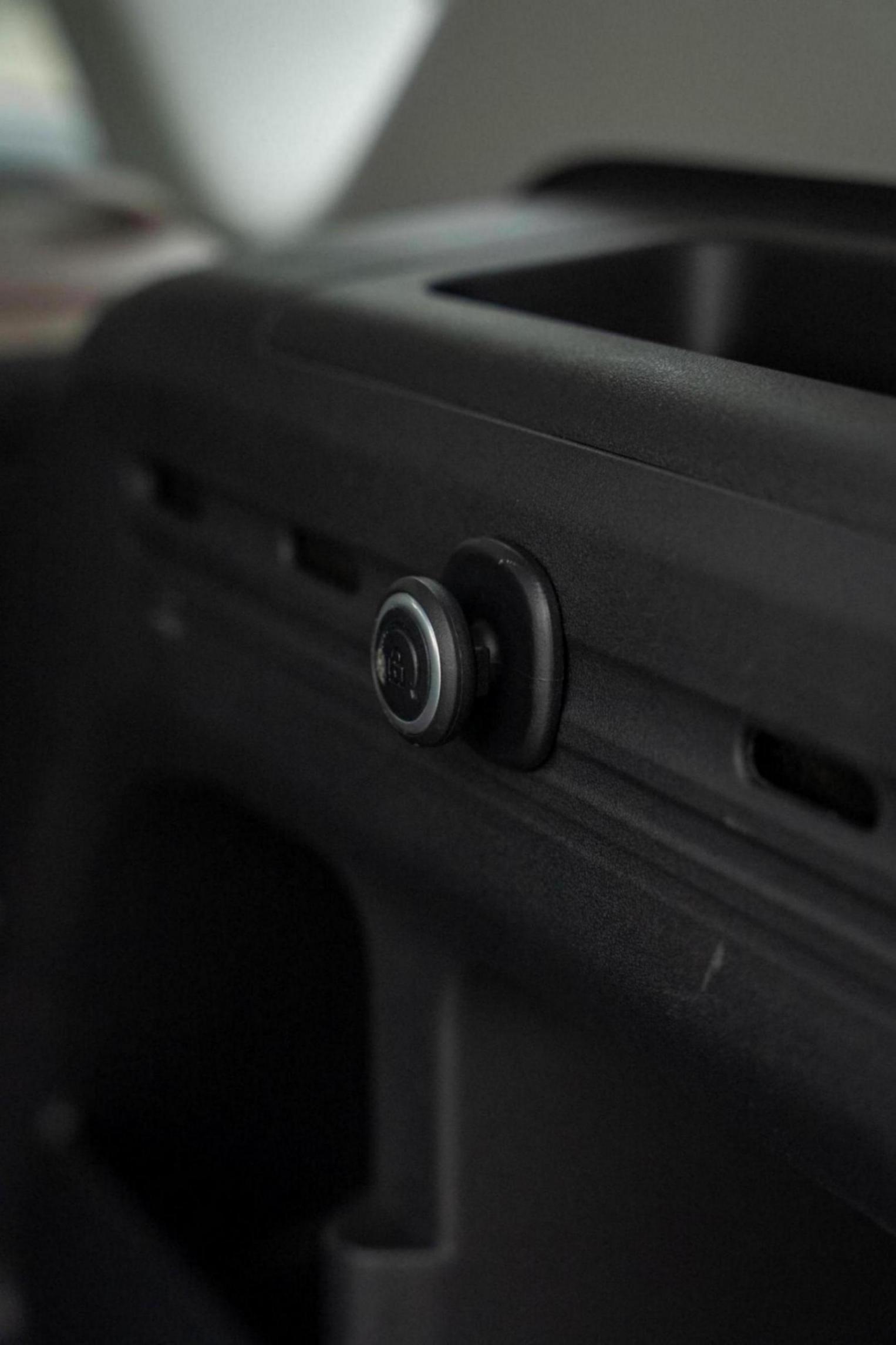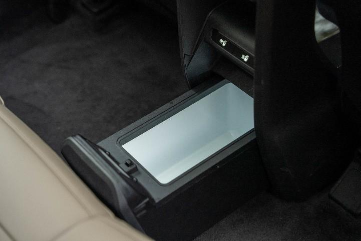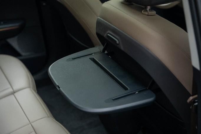 往后看,后排空間剛剛給大家演示過了,功能上講EV5還有個小桌板可以使用,一家人出游時(shí)放點(diǎn)零食什么的很方便。而且長續(xù)航高配車型搭載了容積為4升的冷暖箱,夏天喝冰可樂冬天溫一罐熱茶,舒舒服服。