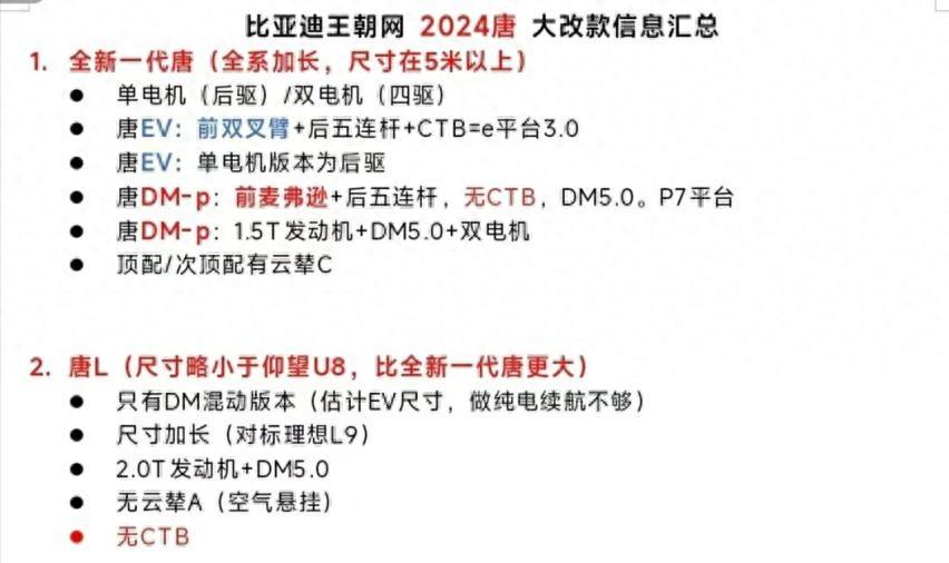 近日,我們從相關(guān)渠道獲取到了一組疑似全新比亞迪唐插混的諜照。其實(shí)此前網(wǎng)上就已經(jīng)有了比亞迪唐系列新車規(guī)劃信息(可以看下圖),新車除了會(huì)搭載全新的DM5.0插混動(dòng)力外,其尺寸還將超過5米,但DM-p系列并沒有CTB技術(shù)。另外,新款依舊會(huì)提供EV版本。當(dāng)然,關(guān)于具體的配置,還是要等官方信息。
