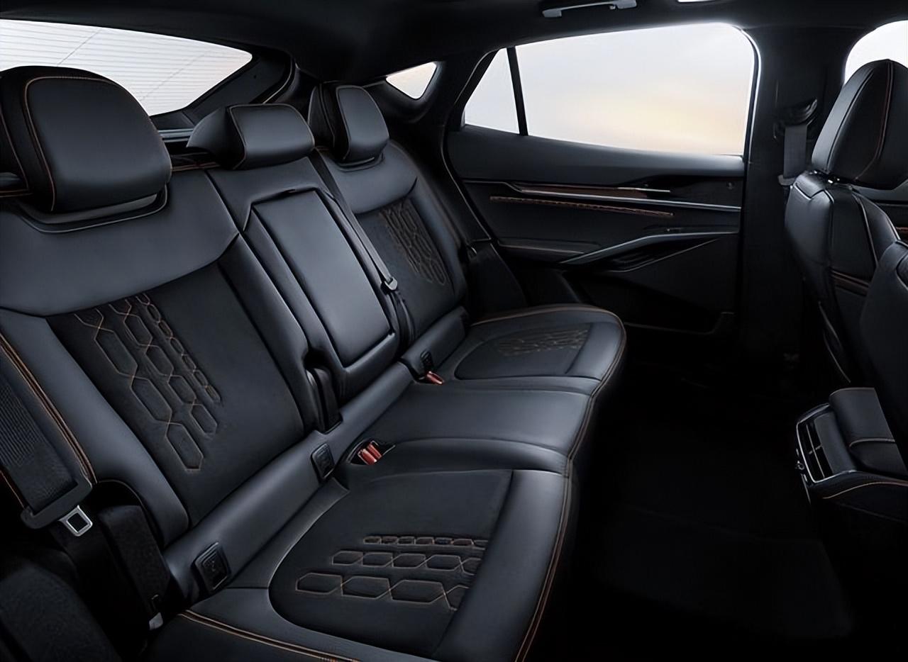 轎跑式的車身、黑色的弧線形車頂和中柱,再加上四個隱藏式門把手設計以及電子后視鏡的設計,不僅更加符合這個時代的審美,也大大降低了整車的風阻系數。R20英寸的半封閉式輪圈配備了255/55 R20的輪胎和紅色的卡鉗,也極具視覺沖擊力。尺寸方面,長寬高分別為4920/1920/1600mm,軸距為2945mm。定位于中型轎跑SUV。車內采用了標準的5座布局,前排配備了桶裝賽車座椅,后排是舒服的沙發座椅,坐墊和靠背都加入了翻毛皮材質,防滑性、舒適性和包裹性都很棒。入門級就配備了膝部氣囊,安全性也放在了第一位。