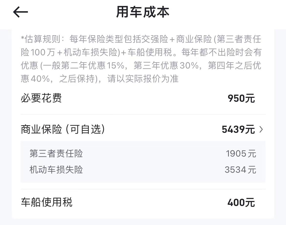 商業(yè)保險:5439元(其中第三方責(zé)任險按100萬元的賠付計算,費用為1905元、車輛損失險3534元,賠付額度可以根據(jù)自己的需求選擇。)
