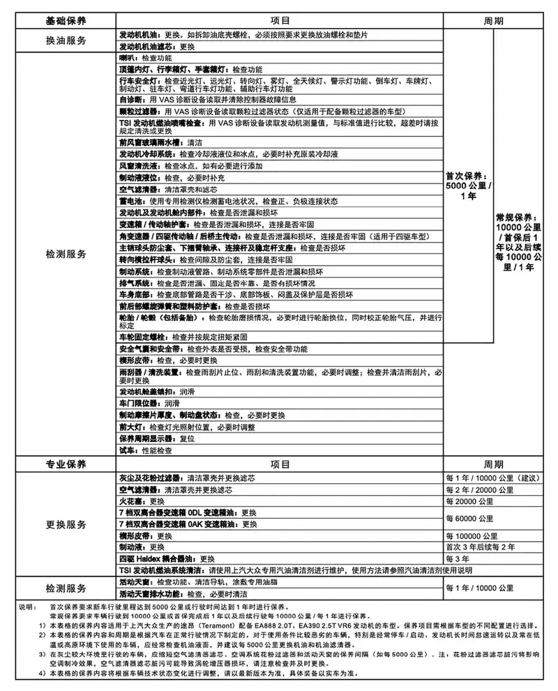 根據(jù)保養(yǎng)手冊,車輛的首保里程為5000km,建議保養(yǎng)間隔為10000公里或12個月(以先到者為準(zhǔn))。途昂X的首次和二次保養(yǎng)僅需要更換機油、機油濾清器,同時還會有多達(dá)數(shù)十項的全車檢測和清潔項目,而像變速箱油、皮帶、以及制動液這些配件基本上在60000公里內(nèi)都不需要更換,四驅(qū)系統(tǒng)的油液也是每3年才更換一回,可以說相當(dāng)省心了。我們大致算了一下,65000公里的總保養(yǎng)費用價格是13258元。在同級別陣營里,途昂X的保養(yǎng)費用還是相對親民的,且保養(yǎng)周期較長。