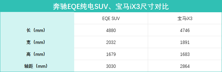 對于SUV而言,空間、載物能力也是關鍵指標,并且對于高端產品而言,座椅舒適性也同樣重要,咱們也來看看EQE SUV、寶馬iX3的表現。尺寸方面,EQE SUV的長寬高分別為4880、2032、1679mm,軸距為3030mm,其整體尺寸也屬于中大型SUV的一流水平,寶馬iX3的長寬高分別為4746、1891、1683mm,軸距為2864mm,其尺寸屬于中型SUV的主流水準。由于EQE SUV整體比寶馬iX3大了一圈,其內部空間也會更寬敞,尤其是后排的腿部空間和橫向空間,其更能滿足后排滿載三人的需求。