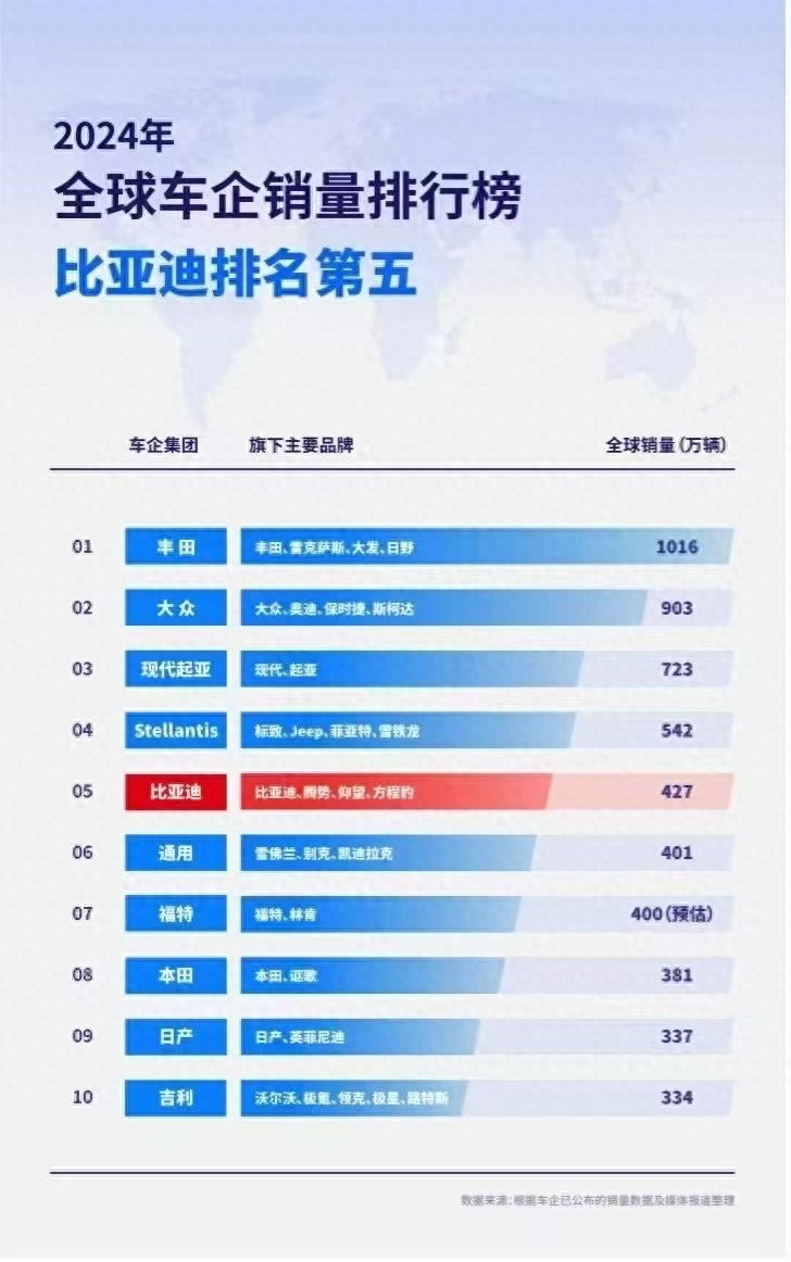 在汽車行業(yè)的 “江湖” 里,比亞迪的崛起就像一部超勵志的熱血爽文。曾經(jīng),它不過是眾多世界級車企中不太起眼的 “小透明”,誰能想到2024年底的比亞迪,已經(jīng)成功躋身世界車企TOP5的行列,這劇情,簡直比爽文小說還精彩!