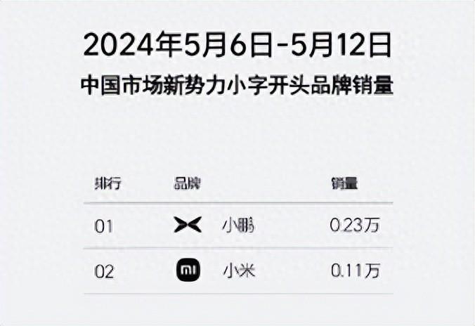 一個是“中國市場新勢力小字開頭品牌銷量”,小鵬以0.23萬臺奪冠,小米排第二,周銷量0.11萬臺,滿足條件的只有這兩個品牌,既是冠軍、亞軍,換種角度看,也是倒數第一和倒數第二之間的惺惺相惜。