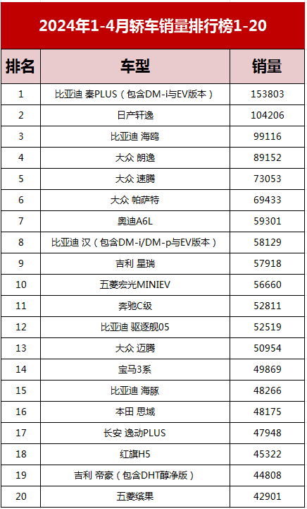 在1-4月的轎車銷量排行榜中,比亞迪秦PLUS以153803輛的銷售成績擊敗多年的轎車銷量王軒逸問鼎榜首。