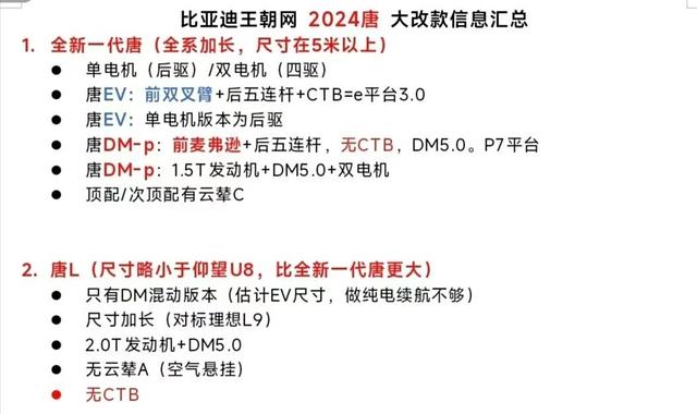 除此之外,比亞迪還將推出唐L車型,該車尺寸將大于全新一代唐,但會小于仰望U8,未來將對標理想L9。唐L將僅推出DM混動版本,不會推出EV版本,這也是考慮到車輛尺寸過大,難以實現長續航。動力方面,新車將搭載第五代DM技術,由2.0T發動機+雙電機組成。新車不會配備云輦-A智能空氣車身控制系統和CTB電池車身一體化技術。
