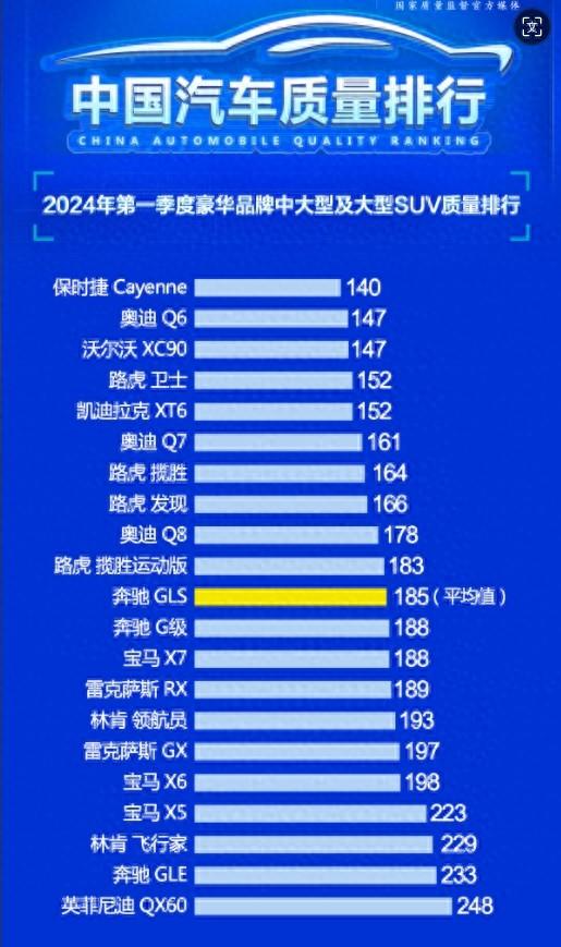 那么,哪些豪華中大型及大型SUV品質(zhì)過關(guān)呢?不妨來看看質(zhì)量測評榜單。日前,中國汽車質(zhì)量網(wǎng)發(fā)布《2024年第一季度豪華品牌中大型及大型SUV質(zhì)量排行》,這份榜單上,共有21款車型參與測評,質(zhì)量測評的平均分達到185分。分?jǐn)?shù)越小代表車型的質(zhì)量越好,接下來,看看哪些豪華中大型及大型SUV表現(xiàn)得更好?